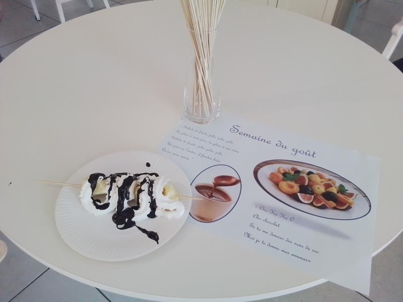 Pour la semaine du goût,les résidents ont participé à un après-midi quiz et poésies sur les fruits puis ont confectionné leur brochette de fruits accompagnée de chocolat fondu et chantilly.